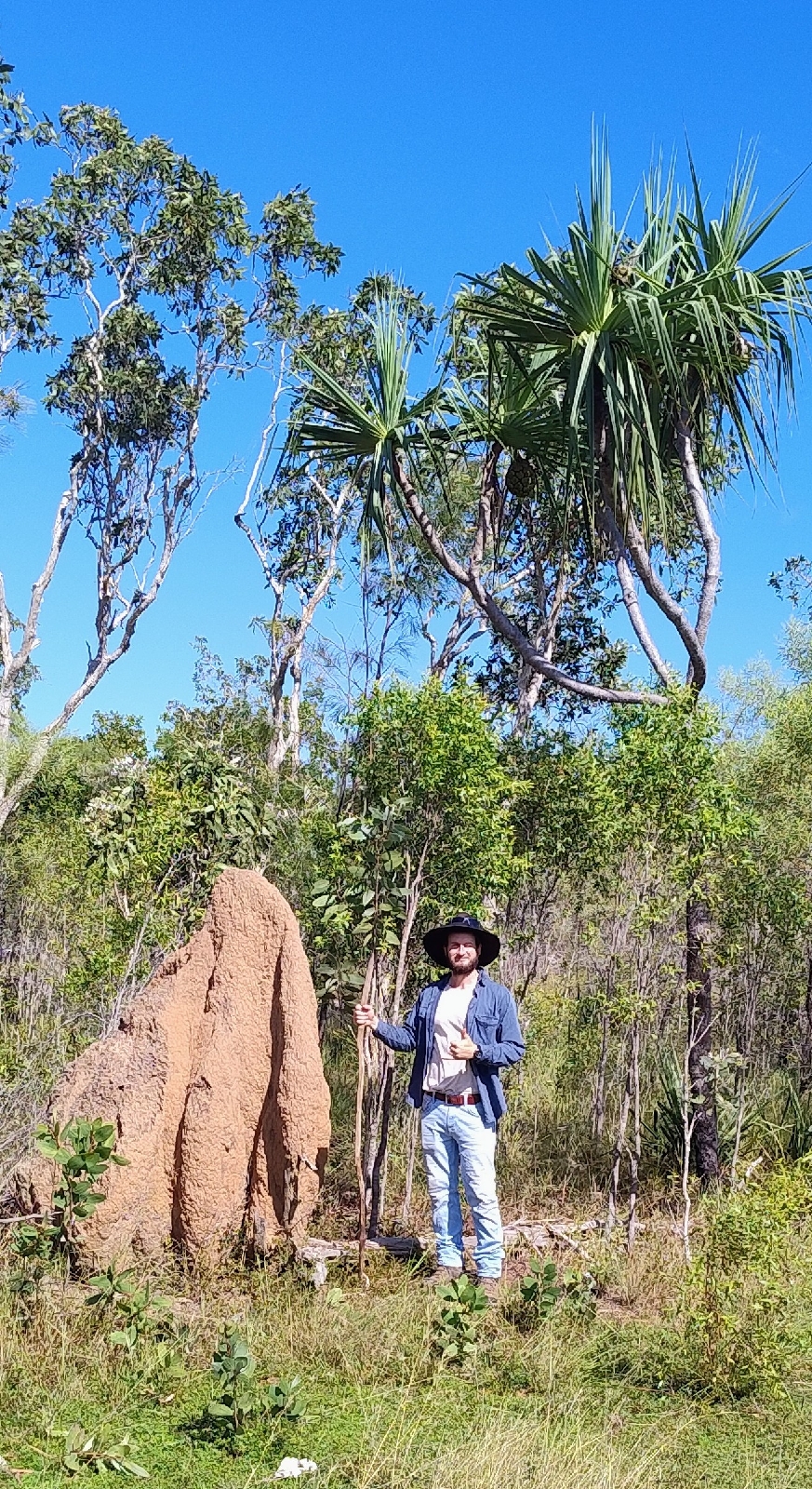 Off again with Dave. We talked about fruit, tree and snake. By around 11 at a truck-pull-off region beside the road we found this ant hill, and pandanas palm.